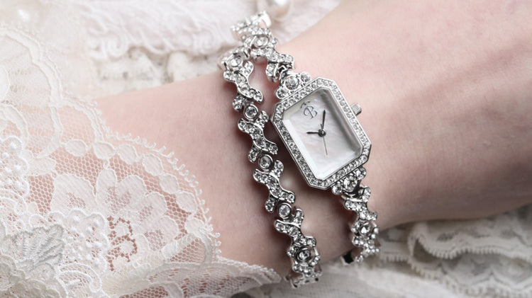 特徴は、マザーオブパールの文字盤にスワロフスキーをちりばめた高級感あふれるデザインと、シンプルなシングルブレスレットです。