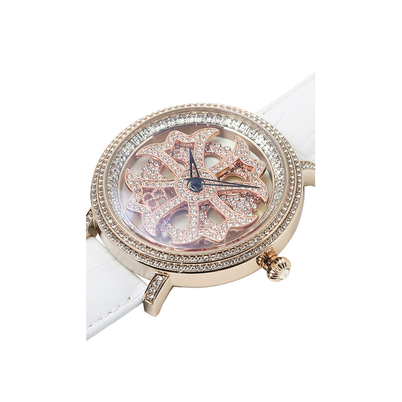 最大の特徴は、クルクルと回転する二層式の文字盤で、スワロフスキーをさらに美しく輝かせます。